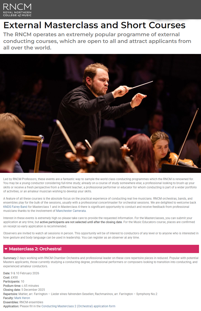 RNCM Conducting Masterclass 2 Monday 9 February 2026 10:30 am 10:30 Tuesday 10 February 2026 5:30 pm 17:30 Google Calendar ICS RNCM, ManchesterRachmaninov Symphony No.2Mahler Lieder eines fahrenden GesellenApplications close 5 December 2025
